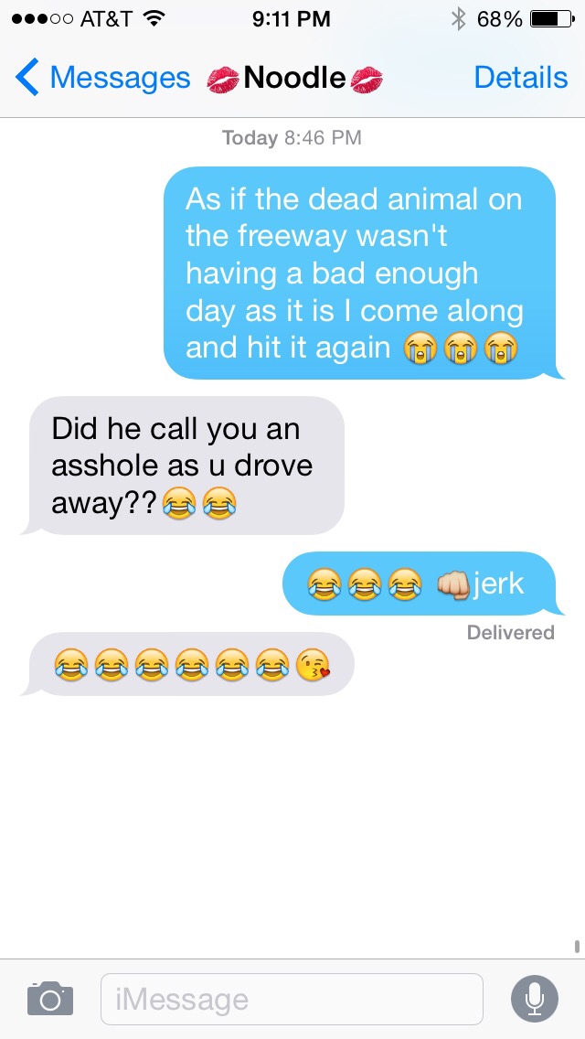 I made a dead animal deader! You wouldn’t think it was possible but I did it! I was driving home tonight and the car in front of me instead of swerving around the animal like a normal person, they went over it so it went through the middle of their tires, leaving me no time to swerve, so I hit it! I am a horrible person! I keep referring to the animal as “it” because I don’t even want to admit what it was, either a dog or a coyote, I’ve convinced myself that it was a coyote, which is still awful. I was so scared to get home and look at the front of my car. What if I had a crime scene up there?! Oh my gosh! Luckily there was nothing, but still, I HIT AN ANIMAL. The poor guy couldn’t be dead in peace, noo it had to be hit again for good measure.