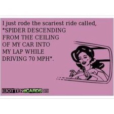 So I was driving carefully but kept watching the spider. It started making a web across my WHOLE windshield! Great, this is just terrible. Finally I noticed it coming my way again after awhile. It was trying to hook it’s web on my door. How dare he! I went after him again! I think I hit him? He either jumped or fell. God knows where he is, please let him rest in peace. I just pray that I don’t get into a giant web when I get in my car in the morning! Seriously the more I fear spiders, the more they come after me!