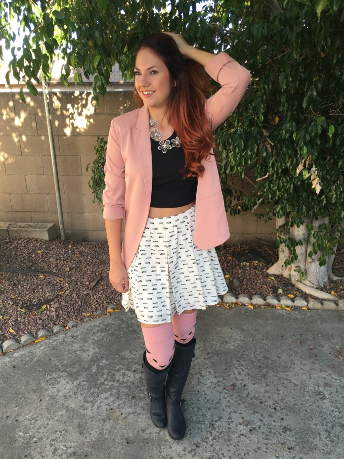 These pink cat socks were the ones I instantly fell in love with when I first looked on their site. How cute are they?! They add just the right amount of fun to an outfit. It’s like little kitties are peeking out the top of your boots. The colors made me think of a dressier outfit, and I immediately thought of my blush blazer. This outfit would be so fun to go out at night with the girls, wear to class, or even to the office (but for the office change the crop top out for a black tank). I paired these adorable socks with my faded black Madden Girl boots, a white and black print skater skirt from Maison Jules, a black high neck crop top from G Stage, and topped it off with a blush blazer and gold daisy statement necklace from Forever 21. Take a look!