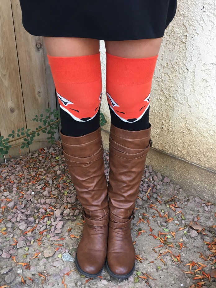 These. Socks. Are. ADORABLE! These have to be the most perfect and fun Fall socks. I kept the outfit fairly simple because I didn’t want to take away from the socks too much. I paired these cuties with my cognac Madden Girl boots, a simple synched waist black dress, a tan leather belt, and topped it off with my camouflage utility jacket from Forever 21 with the sleeves cuffed, and a simple long black and gold necklace from Charming Charlie. I am like a hunter and a fox in the same outfit! PS- I know it is hard to see but I think I actually achieved a Serena Van der Woodsen ponytail! GO ME! Anywise check out the look…