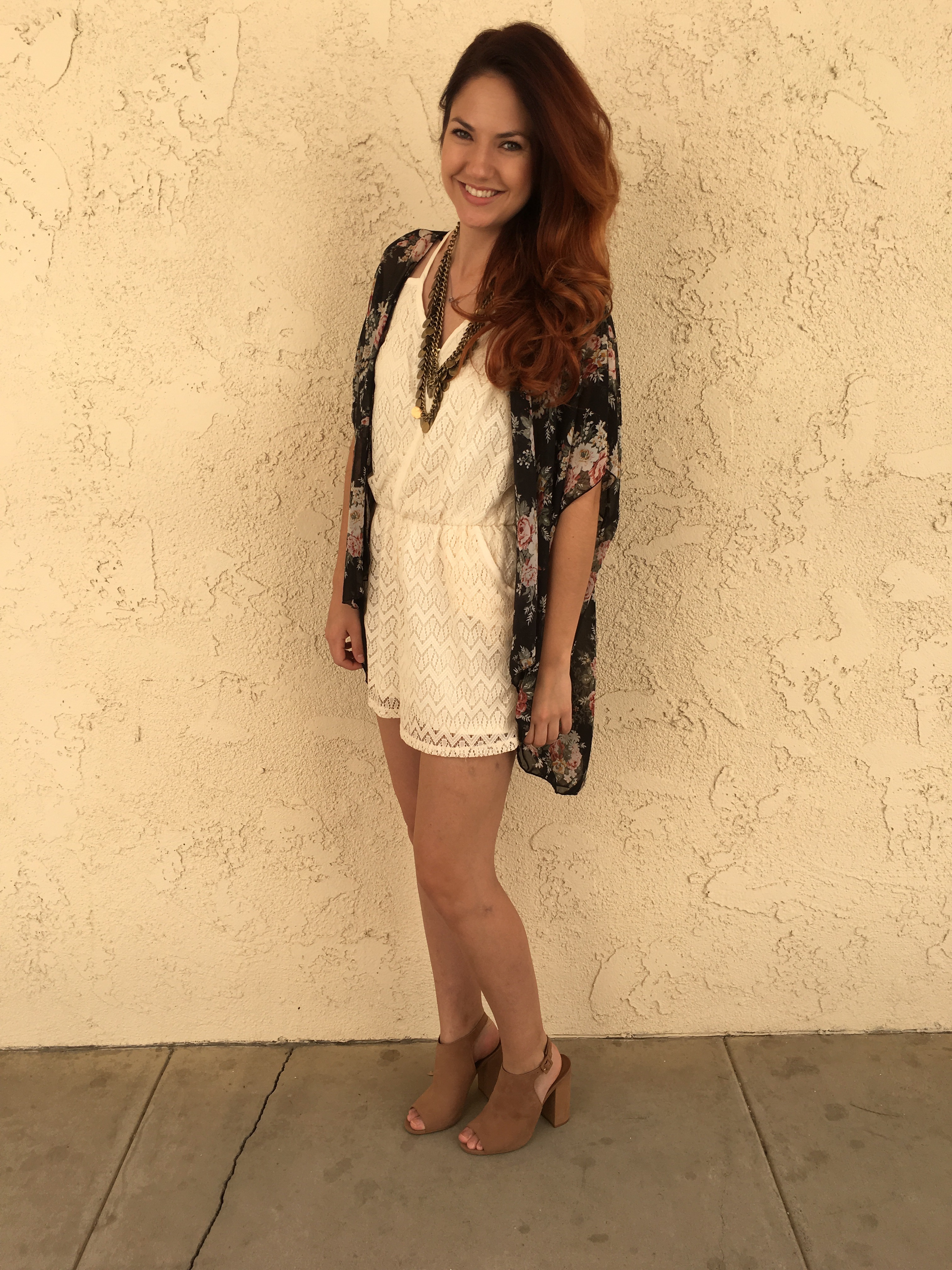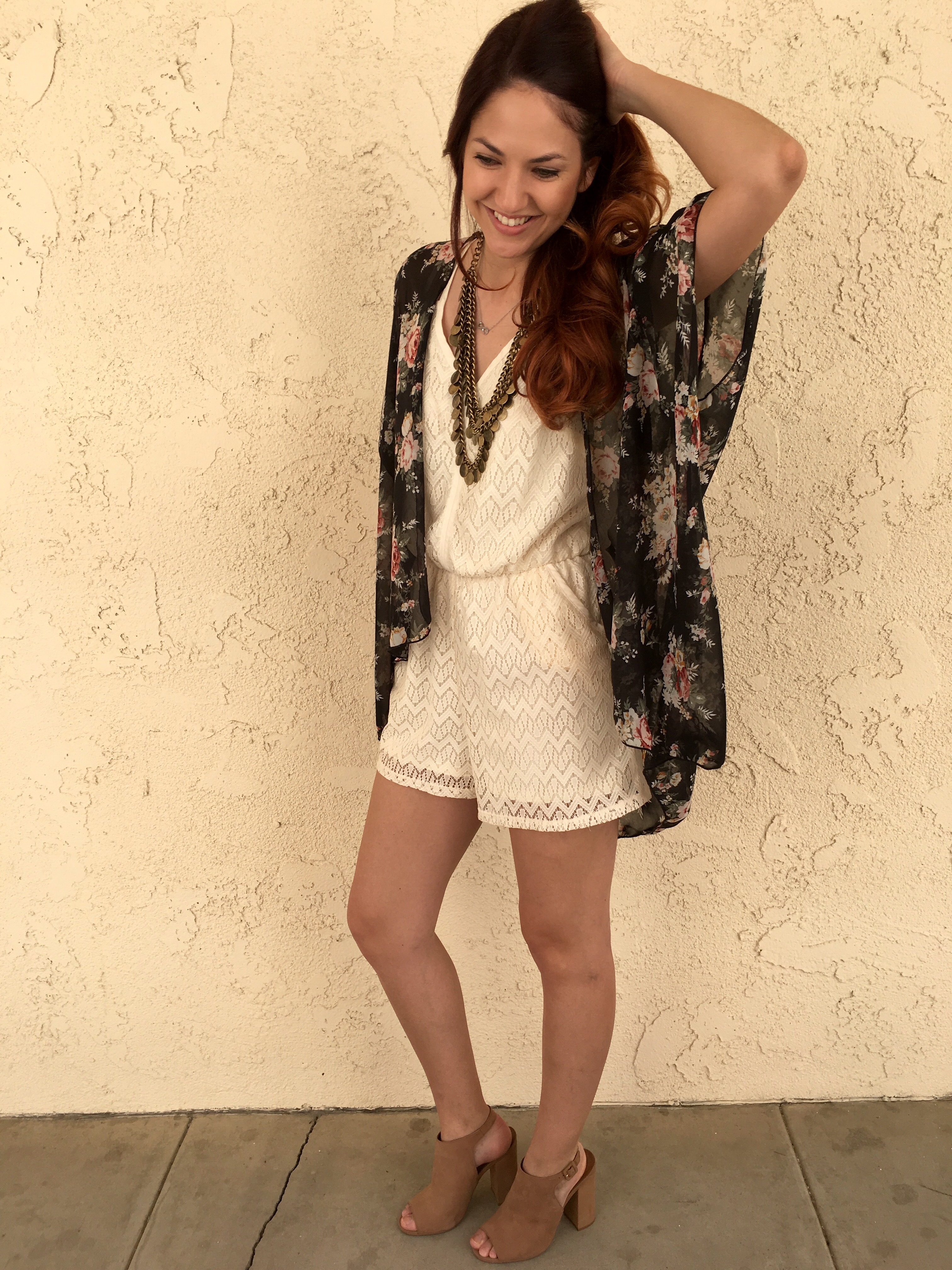 I was really happy with how this outfit turned out. I found the kimono last weekend at my sister’s bachelorette party in Palm Springs. The store is called Heavenly Couture and EVERYTHING was $16.99! I could have bought way more but I had some self control, but only some. To be honest I wasn’t sure how the kimono would look paired over my collard chambray top but I think tying the bottom of the top really helped. This is the chambray top I got from the Who What Wear line at Target. The shorts are from Topshop at Nordstrom. I am really excited to see how else I can style this kimono, especially for work. I will definitely be trying it this week. At Heavenly Couture, they had it styled over a mauve dress and belted. I want to try something similar because it was super cute! Check it out, and note, I have only gotten a couple pictures back from Sarah so I will be sure to share the rest when I get them! You can totally tell the difference between her photos and mine LOL! She is just such a good photographer!