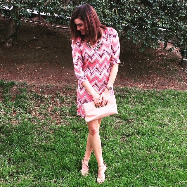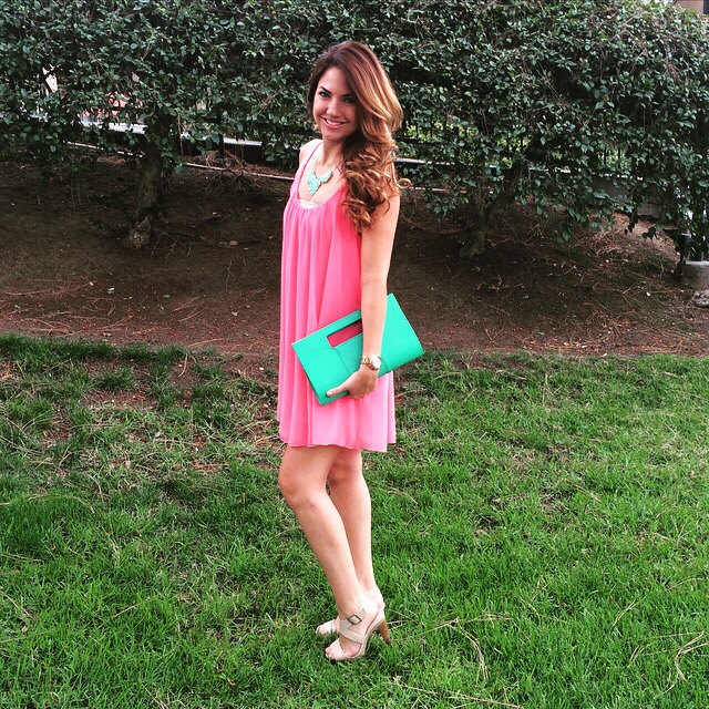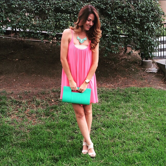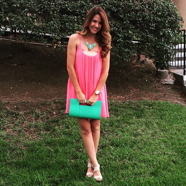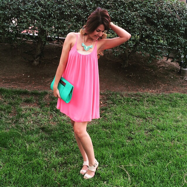 One of the reasons I had been looking forward to the wedding I attended on Saturday was because I was so excited about the outfit I was going to wear! I picked this out like over a month ago, ever since I saw a picture on Pinterest. The color combination was so cute that I was determined to recreate it. I love recreating outfits from Pinterest, it makes me feel so accomplished, and it is fun to make it your own way too. The dress in the picture was more of a coral, I however found a more hot pink shift dress, and get this, it was only $20 from one of my go to stores G Stage. To find the mint/tealish accessories I went straight to my go to accessory store, Charming Charlie. I am obsessed with this store and really should not be allowed to go in by myself. I had no worries about finding the right color I needed for my necklace and clutch, this store is accessory heaven! I even found more than one option and almost couldn’t decide. I ended up with the perfect match though and at a good price, the necklace was $12 (I believe or around there), and the clutch was $25! Of course I had a coupon too- hooray for smart shopping! As for my heels, I stuck with the best pair of heels I have ever owned. I was in one of my best friend’s weddings (you may know her from Glitter It Gold) in August and we got the best heels! They are beige heels by Levity from DSW and has been the best money I have ever spent on shoes, and they were only $50 or $60! I wore them in her wedding, to our next friend’s wedding, to the bridal shower for the wedding this past Saturday, AND to the wedding as well. They are just so comfortable and match with so much!