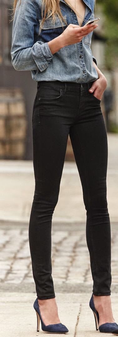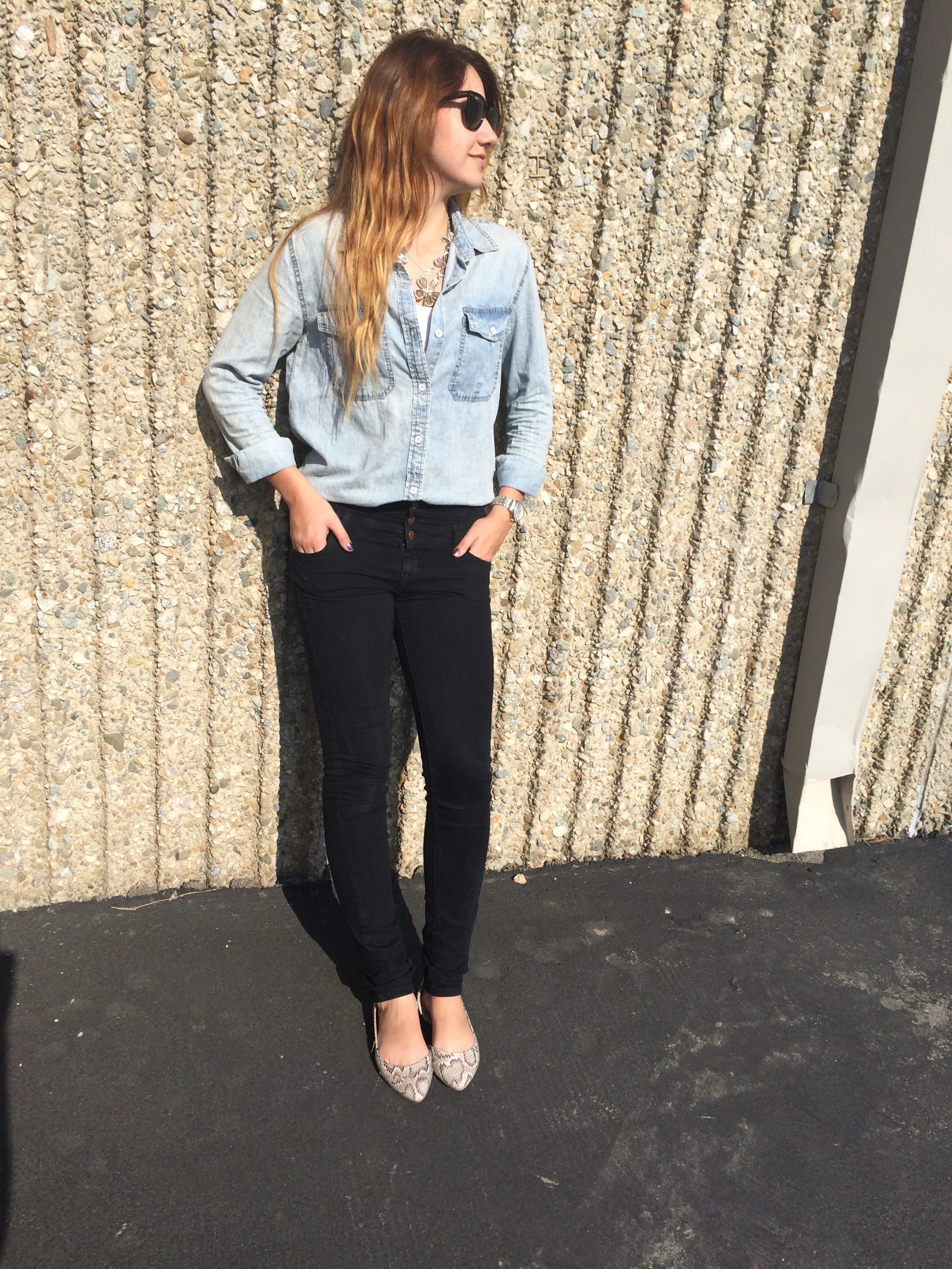 Sometimes the day just calls for denim, and a lot of it! I took advantage of one of the only cool days this week, and when I say cool I mean 88 degrees. I found another outfit on Pinterest that I could recreate easily since I had all the pieces already, I just had never thought about pairing them together. Black high waisted jeans with a blue chambray button up, completed with a pair of snakeskin flats and a gold statement necklace. LOVED this.