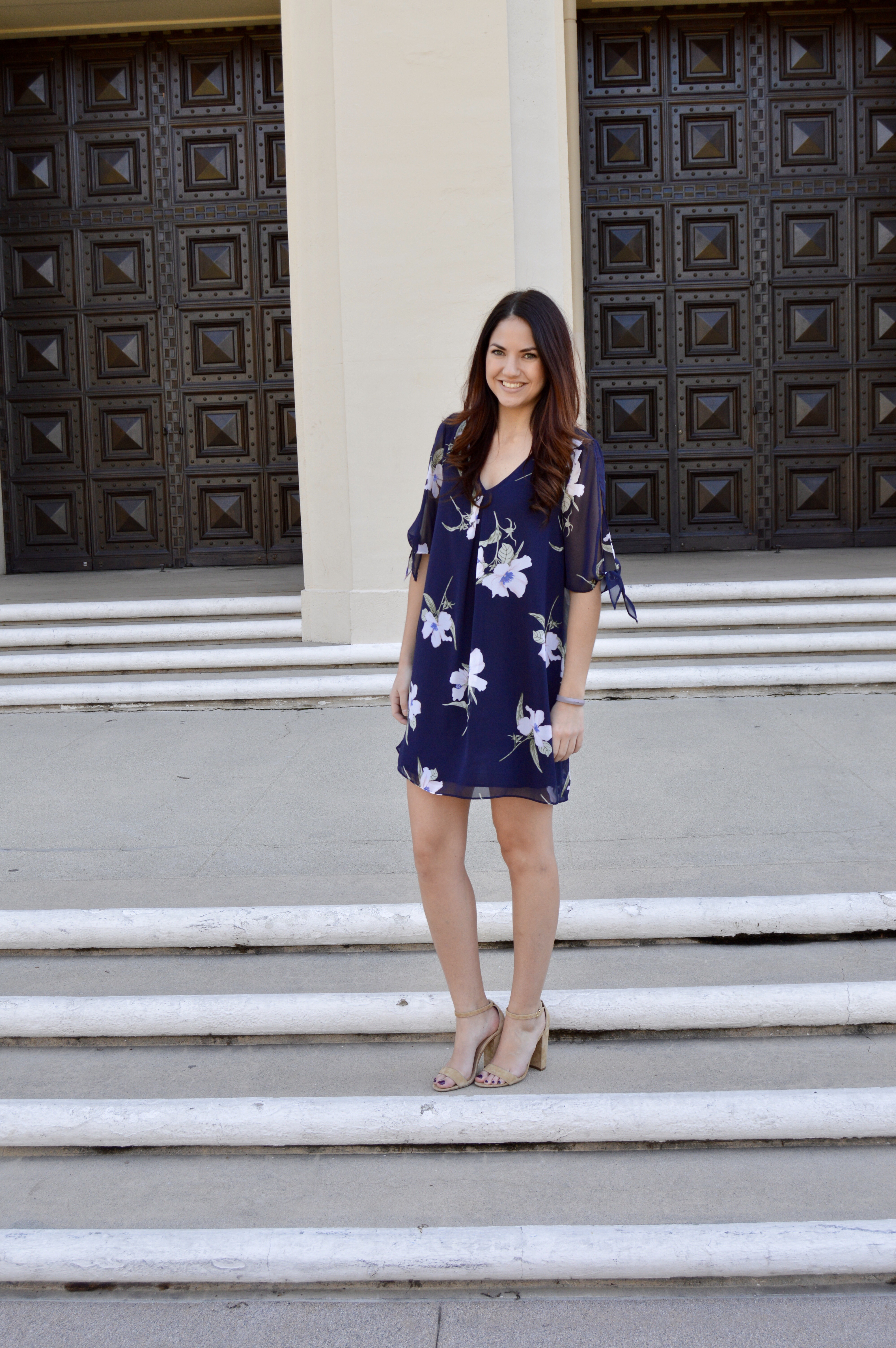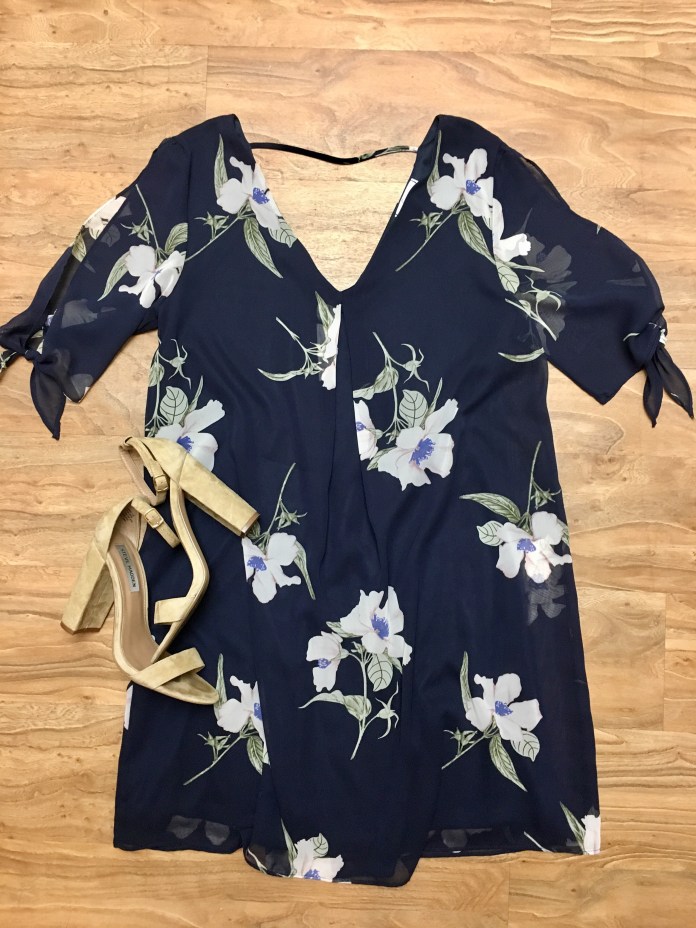 Happy Wednesday! We are half way there, just hang on a little longer! I wanted to share this cute little dress I got last week for a nice dinner. We had a friend take my boyfriend and I out to a really nice place called The Summit House and I was going crazy trying to figure out what to wear. I knew the restaurant was nice but I wasn’t sure how nice and most, or really all of my dresses were not right for the occasion. I recently got rid of quite a few and am in need of replenishment. I found this loose navy, floral chiffon shift dress at Nordstrom for just under $50! The colors are still great for winter but the flowers make it okay for spring as well. When I saw it I instantly thought I could wear it with my tan Steve Madden heels. It looked super cute and was dressy enough and not over the top! The sleeves are super cute too, they are slit and tie at the bottom. I can’t wait to wear it again for a brunch. For anyone interested in sizing, I’m 5’8″ and I got a small and it was just long enough!