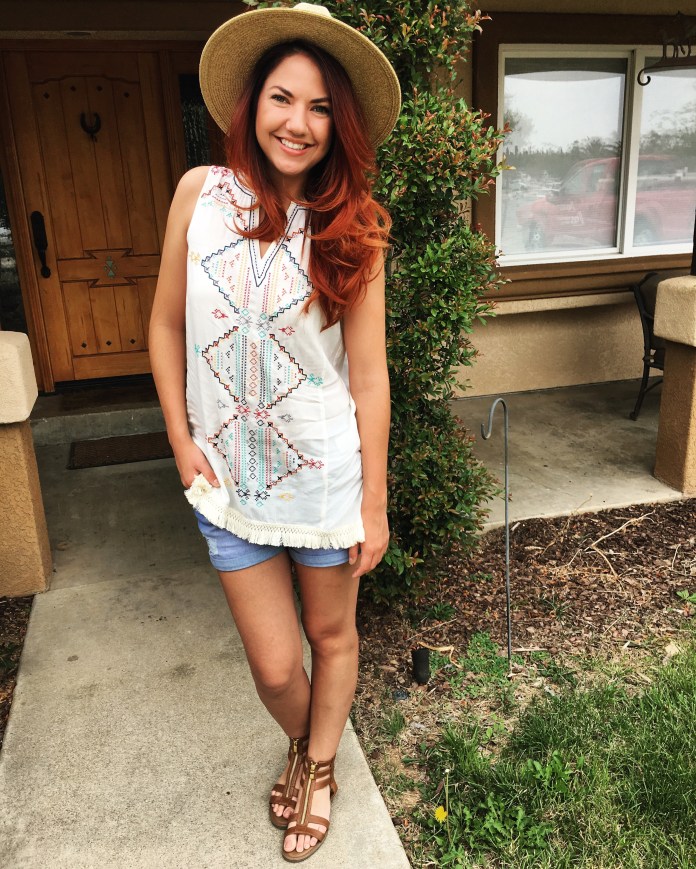 The first one I got was this tank that I like to call my indian top but it is actually named the Embroidered Tank Top in cream. You’ll see what I mean when you see the embroidery. I LOVE this tank! It has the cutest fringe detail on the bottom and is pretty long on, but not too long where it looks weird with shorts. On Memorial Day weekend I wore it with my boyfriend shorts from Old Navy, and my new Gladiator sandals and hat both from Target as well.