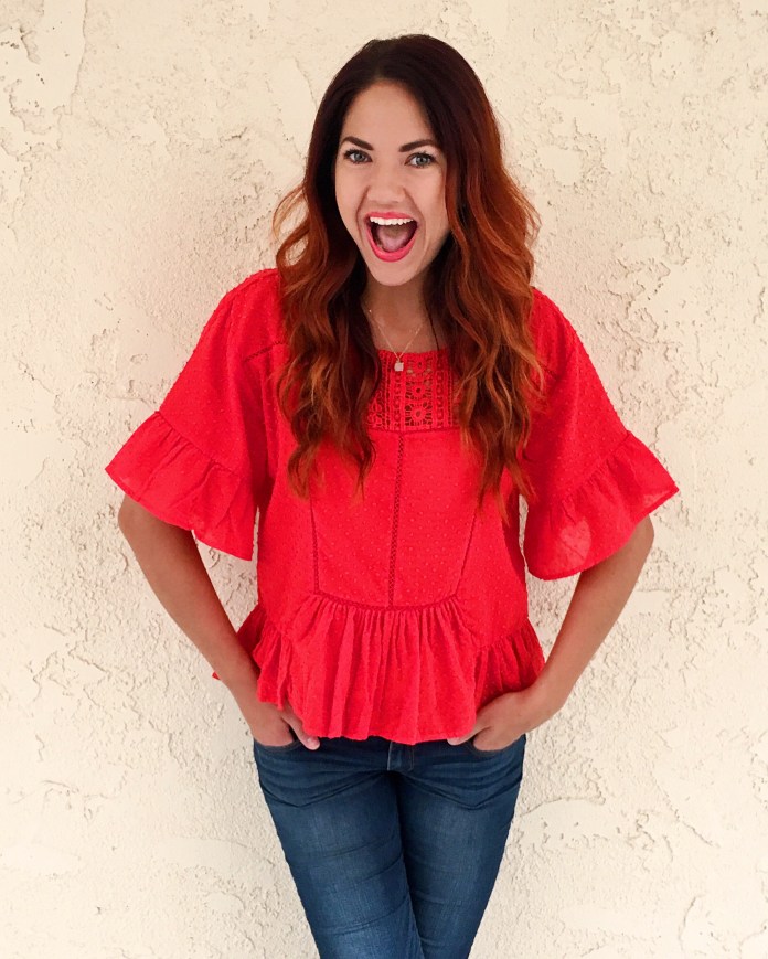 The ruffle peasant arms and ruffle peplum bottom make this top feel so girly! There is also a subtle polkadot detail on the entire top that is in the same color as the rest of the fabric however it is textured, you can feel the polkadots. The crocheted neck helps to keep the boho feel. Also how awesome is this bright red?! I recently discovered that I can actually can wear red with red hair, and I like it! I am wearing red this weekend too but that is for a different post!