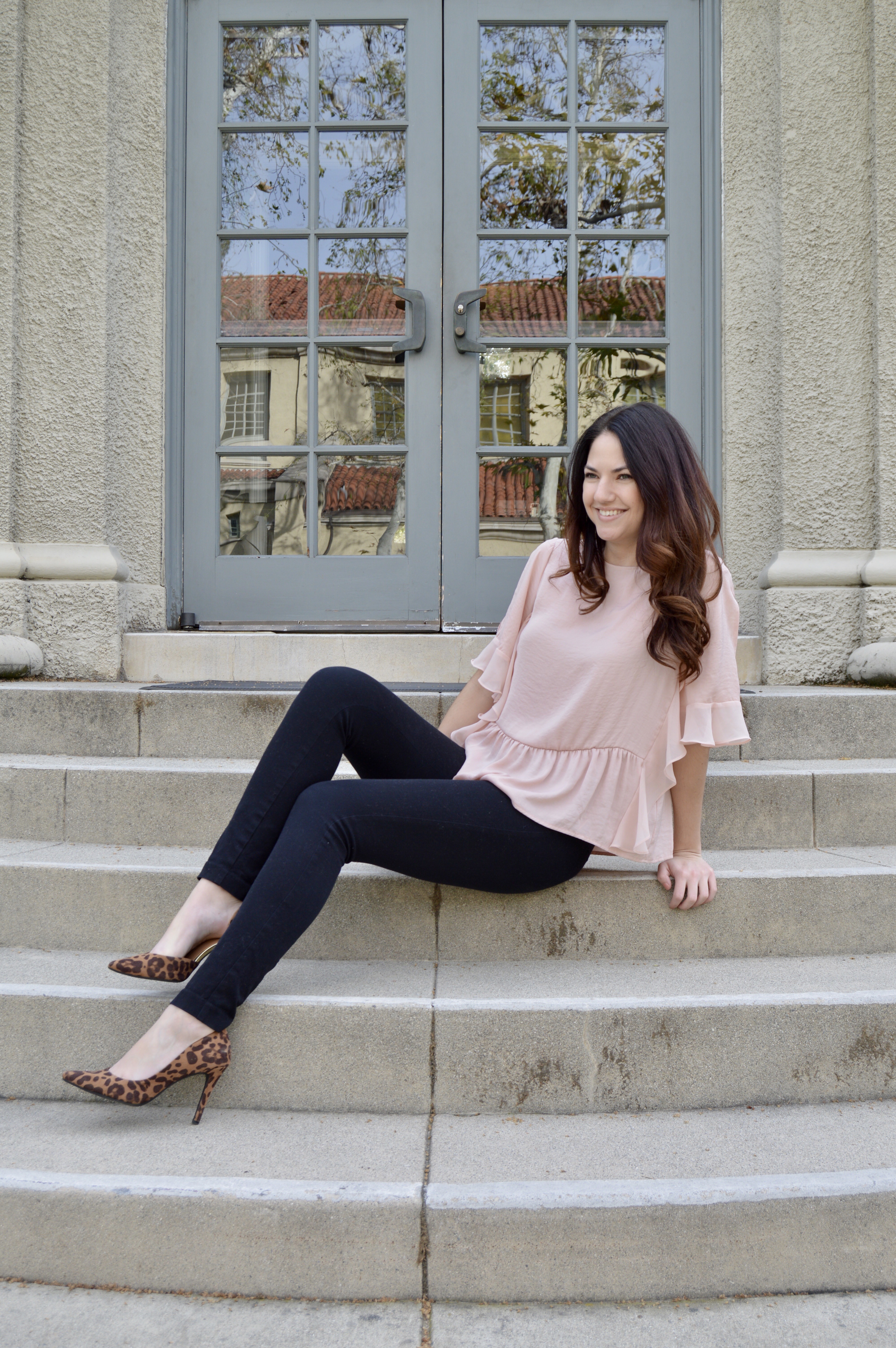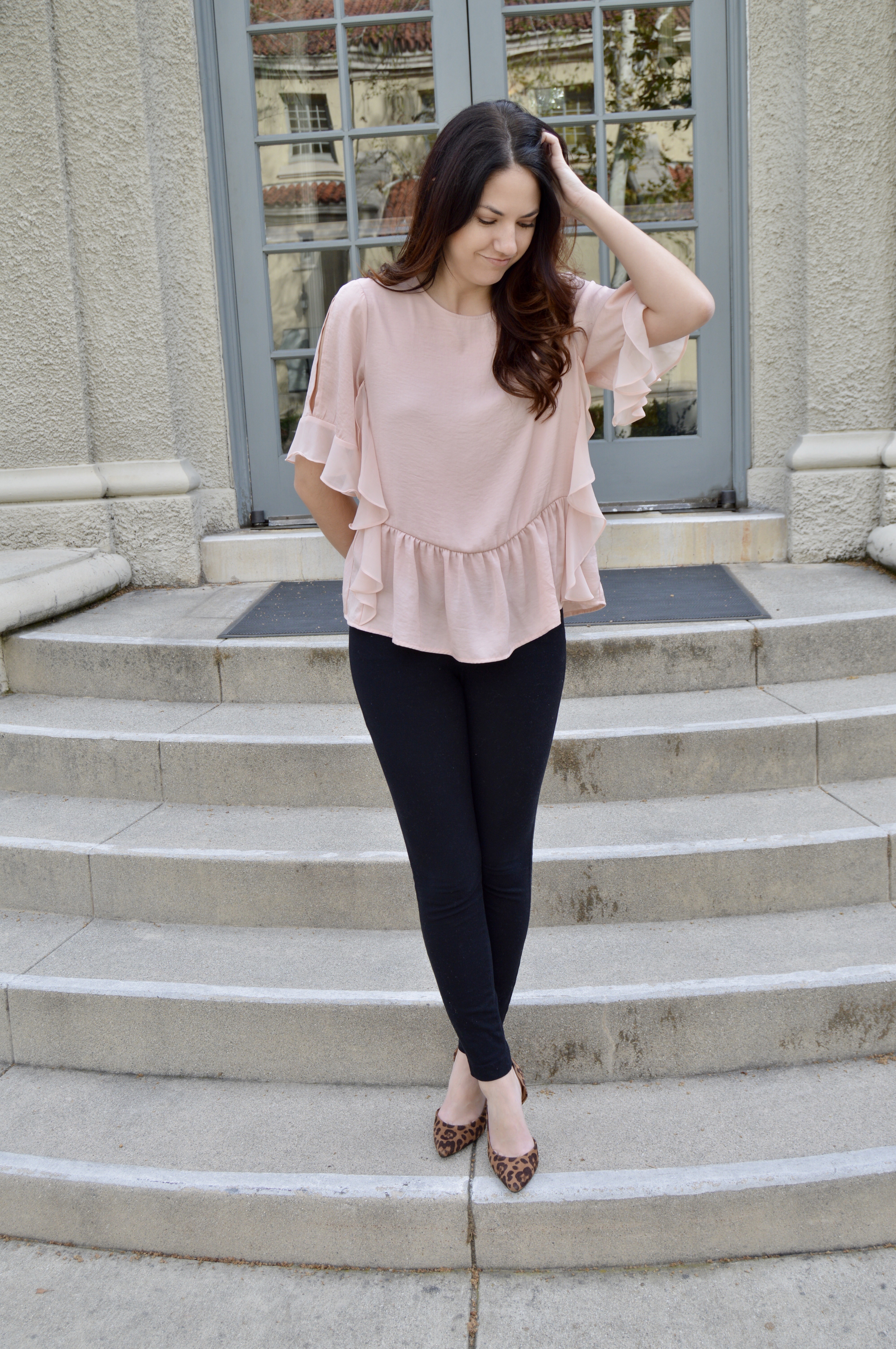 I am absolutely loving how big ruffles are right now. They are just so cute and girly. I feel like ruffles make you look more dressed up than you are, which can be really fun. I got this light pink ruffle top from the Who What Wear line at Target and it is so cute (see I told you I was really into pink tops right now). The ruffle detail adds enough flair to be able to just wear the top with slacks for work, you don’t need to add anything else to look put together. Simple outfits are great to have, especially on those mornings when you’re running late and need to grab something quick to wear. I paired this top with black slacks and leopard pumps (just for fun) and it was so easy and comfy for work. I also want to try it with white slacks and tan heels next. Wouldn’t that be cute?! (It would work with jeans to for casual Friday or the weekend too!) You can find the top here!